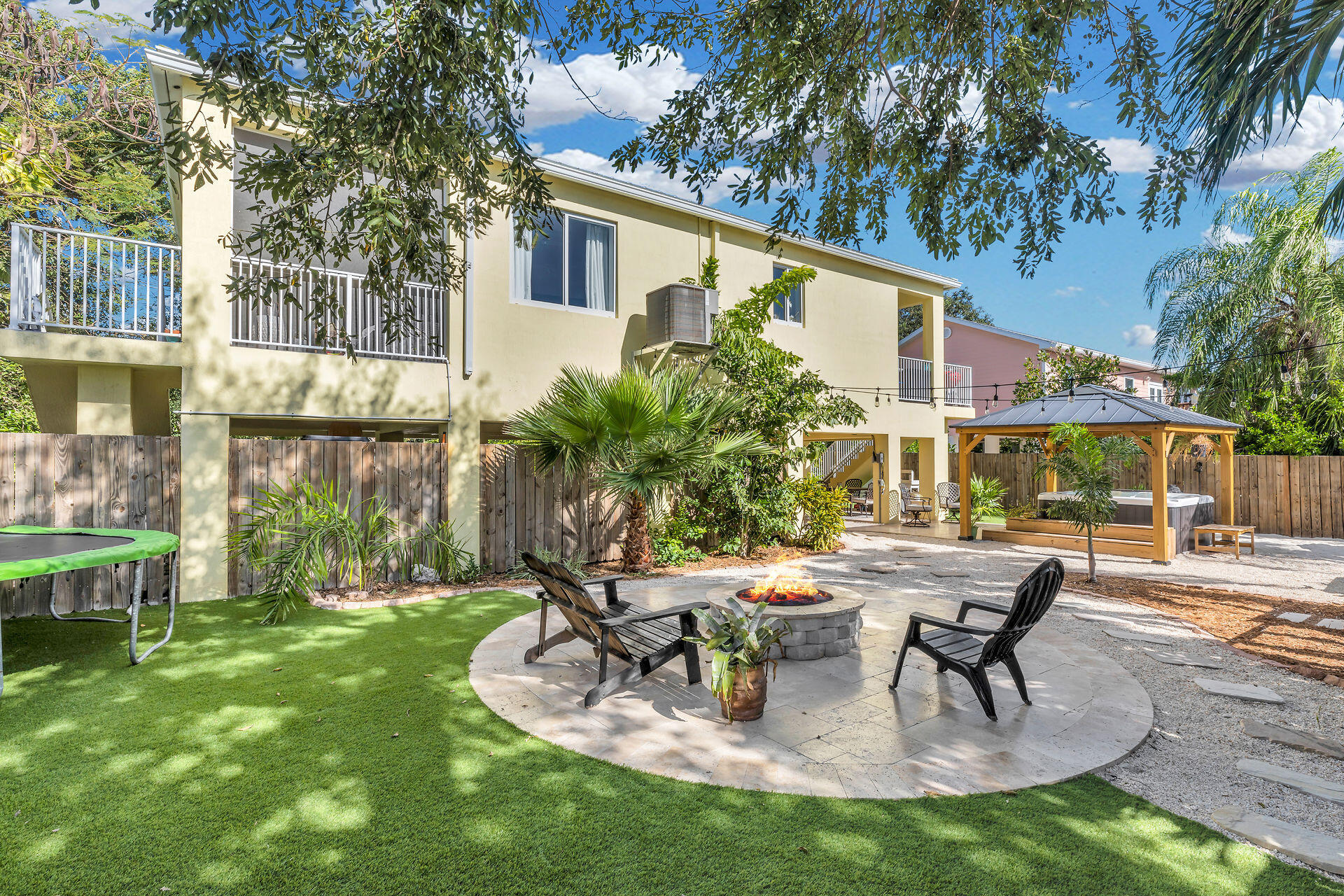 A perfect balance of strength and beauty, step up into this solid, newly built CBS stilted home with poured concrete floors, impact windows and doors and metal roof. From the screened porch, look out over a beautiful fenced in and finished back yard with mature landscaping, stone fire pit sitting area, covered hot tub and plenty of room to entertain in a lush setting. Enter in to a split floor design with high ceilings and open layout. Kitchen features granite countertops, stainless steel appliances and tile flooring throughout. Primary bedroom and a spacious en suite bathroom and laundry are located off the living room, along with another front bedroom. Additional bedroom and bathroom are located off the kitchen with a door that can be closed for privacy with access to a covered back porch and back stairway. Split floor design offers privacy to guests or a great set up with kids. Screened front porch is the perfect place to enjoy your morning coffee while listening to the birds in this peaceful neighborhood. Store your bikes, kayaks, golf carts and vehicles under the covered parking area and also enjoy dining and entertaining in a private outdoor covered setting. Pride of ownership is seen with every attention to detail. Room for a pool in back yard if desired, and front yard offers spacious parking for boat, trailer and vehicles. Find yourself just a couple blocks from Sunset Bay Park where you can launch kayaks and watch a beautiful Florida Keys sunset. Enjoy bike rides and golf cart rides in the family friendly neighborhood and along the bike trail that makes up part of the Overseas Heritage Trail. Just six miles from the center of Marathon with all your shops, restaurants and schools. This single owner home is a must-see Oasis at the end of a quiet street in a peaceful neighborhood.