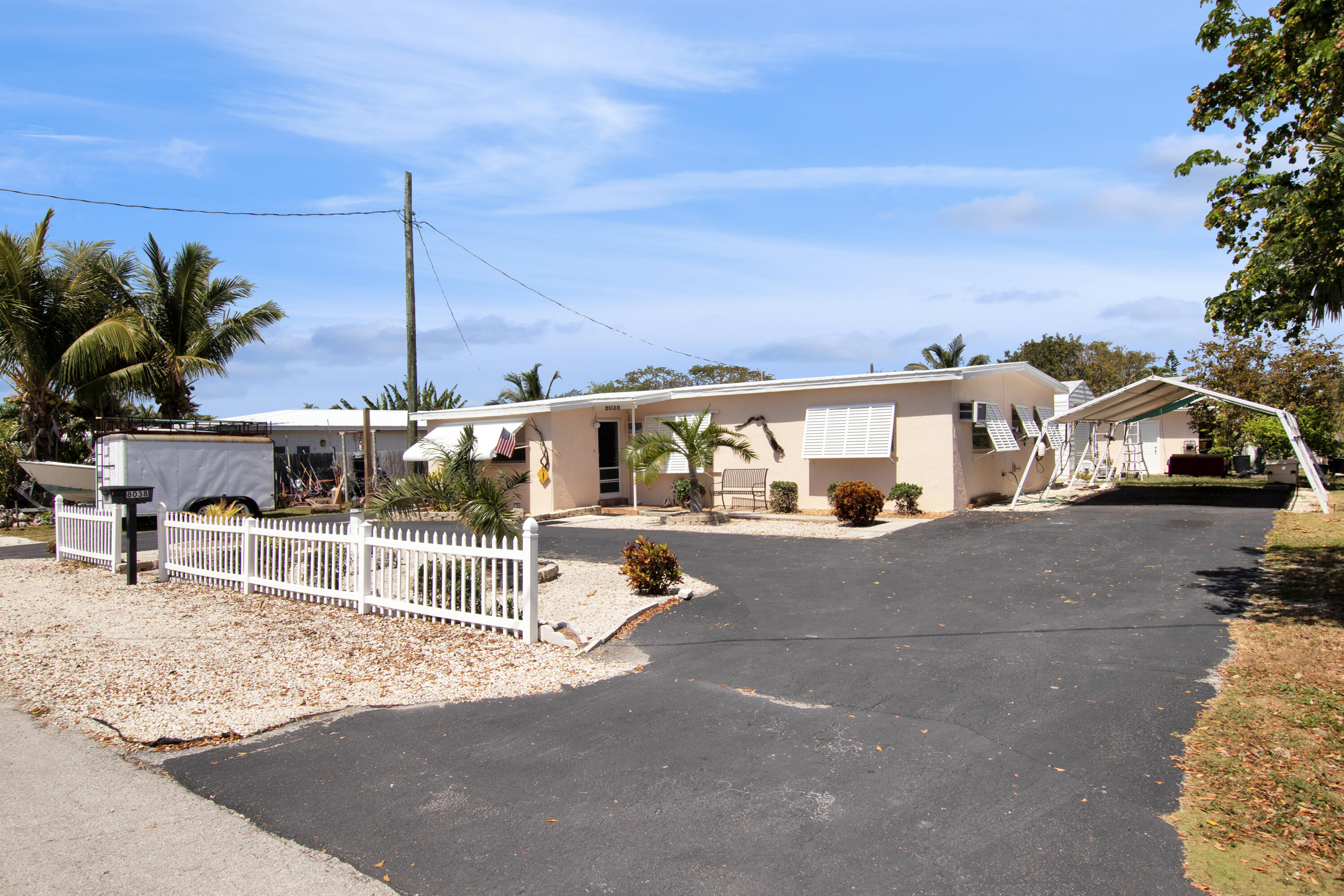 Charming home on a spacious lot in the best of Marathon's neighborhoods. White picket fence, Bahama shutters, paved circle driveway and palm trees create a welcoming entry. CBS home with metal roof and freshly painted exterior opens into living room with nice tile and wainscoting. Kitchen offers ample cabinetry storage and a dining nook. Step into the hall to find a renovated guest bathroom, three bedrooms with closets and an office/laundry room. Office/laundry room could easily be converted into a fourth bedroom. Master bedroom offers an ensuite bathroom. Extra storage provided in a hallway closet. Step out of the kitchen onto a spacious back deck great for entertaining or dining outside with a side nook perfect for morning coffee. Ample room for a pool. Great area for gardening, property has many fruit trees: mango, banana, sugar apple and starfruit. Enjoy the space to work in your own backyard workshop and store tools and gear in separate storage shed. Fencing almost encloses the back yard. Plenty of room for parking and to store your boat and/or RV. Community boat ramp is just around the corner allowing easy access to the water. Paved four mile bike trail encircles the airport offering a nearby path for biking, running and skating. This charming 3/2 home in the heart of Marathon offers easy access to your shops, restaurants, and groceries all while nestled in a welcoming and family friendly neighborhood.